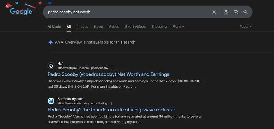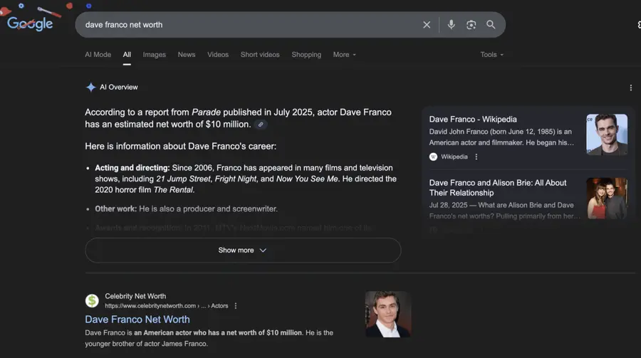 Within a few weeks, I'm willing to bet that when you Google any of these net worths, Google's AIO and AI Mode products will display our number and credit another website. And that's the purpose of this experiment.