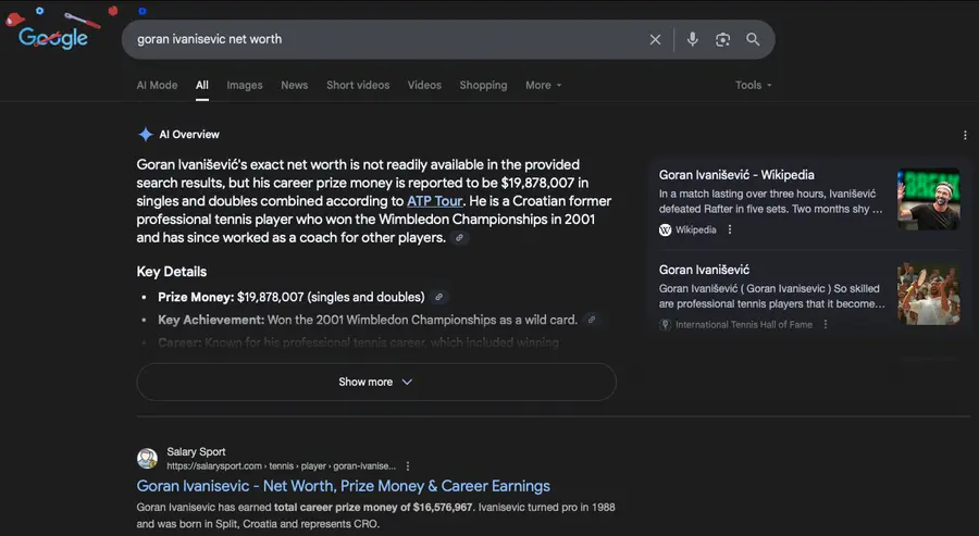 I'm using this article to conduct and track an experiment related to how Google's "AI Overviews" (AIO) and "AI Mode" products display results for net worth searches.