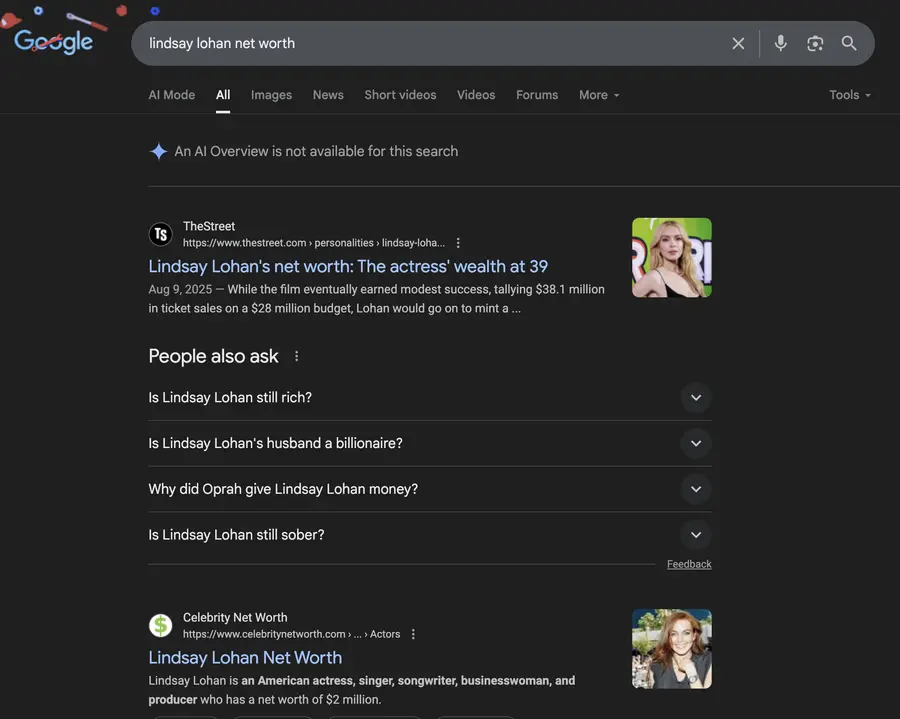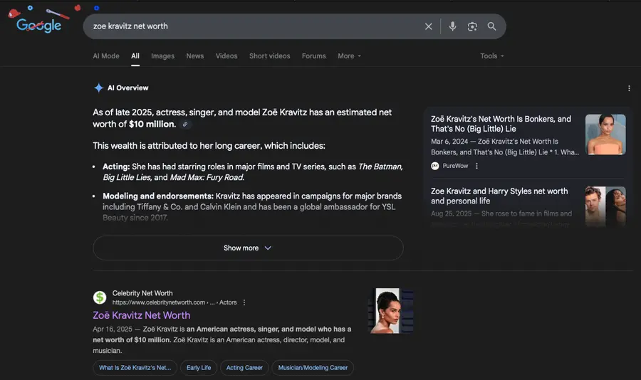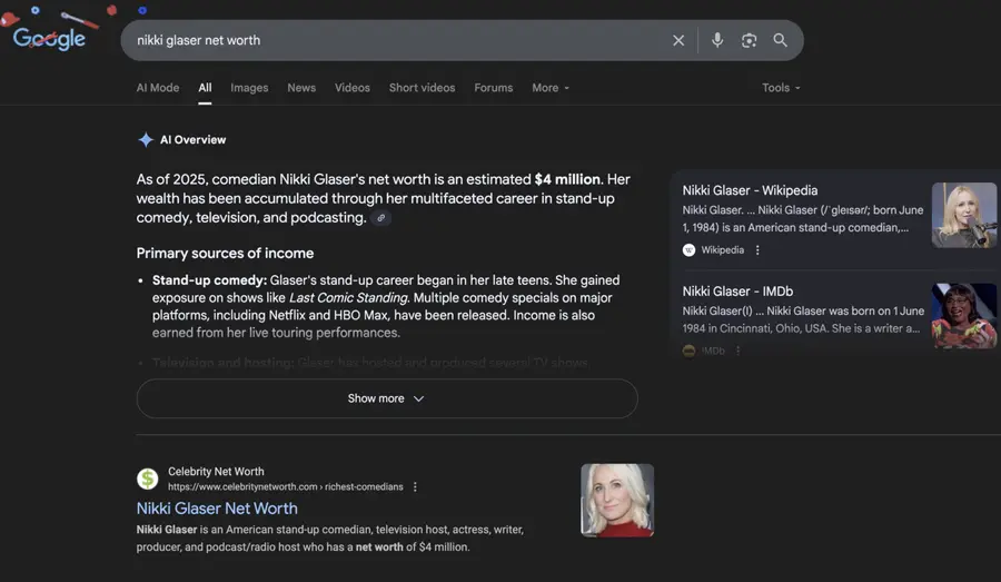 For whatever reason, whether it's technical or an editorial choice, AIO and AI Mode will not credit CNW for a net worth search. In the last few weeks, we conducted over 1,000 net worth searches, and CNW was NOT CREDITED A SINGLE TIME as a source for proprietary information that originated on our site. The sites that are given credit are typically SEO-regurgitator sites disguised as news sites that make it a practice to publish timely "Net Worth" articles for the sole purpose of ranking in Google. More often than not, the SEO regurgitators credit and link to CNW as their source very clearly within their regurgitations, but sometimes they simply steal and repeat our info.