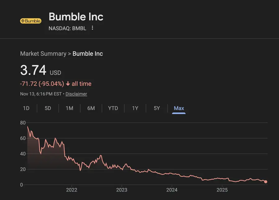 Then came 2022. And 2023. And 2024. Each year brought a new round of disappointing guidance, weaker-than-expected earnings, and intensifying competition from Tinder, Hinge, and an explosion of niche dating apps. Here's a chart of how Bumble's stock has performed since going public in early 2021. Note the red "all time number":