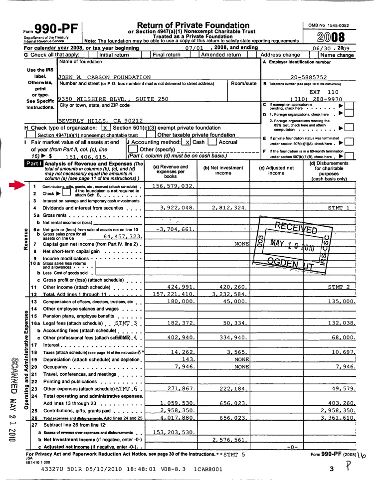 In August 2010, The Smoking Gun uncovered a subtle IRS filing that the John W. Carson Foundation filed an IRS Form 990-PF. Here's the actual form, note the red arrow: